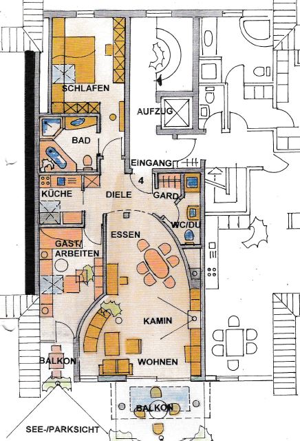 Die sonstige Ausstattung ist mehr als exklusiv: Moderner 55 Zoll Flat-Screen mit Kabelanschluss und Streaming-Funktion sowie Bose-Musik-System. Tolomeo-Leuchten in allen Räumen. Hochwertige Echtholz-Einbauten in Handarbeit – teils Weiss, teils Kirsche. Gegensprechanlage mit Video. Küchengeräte und -untensilien von Fissler, Rösle und Gläser von Riedl. Ferner 2 Kaffeemaschinen (Nespresso inkl. Milchschäumer und traditioneller Filterkaffee), Mixstab, Siebe, Kochtöpfe, Pfannen uvm. Toaster und Wasserkocher von Porsche-Design.